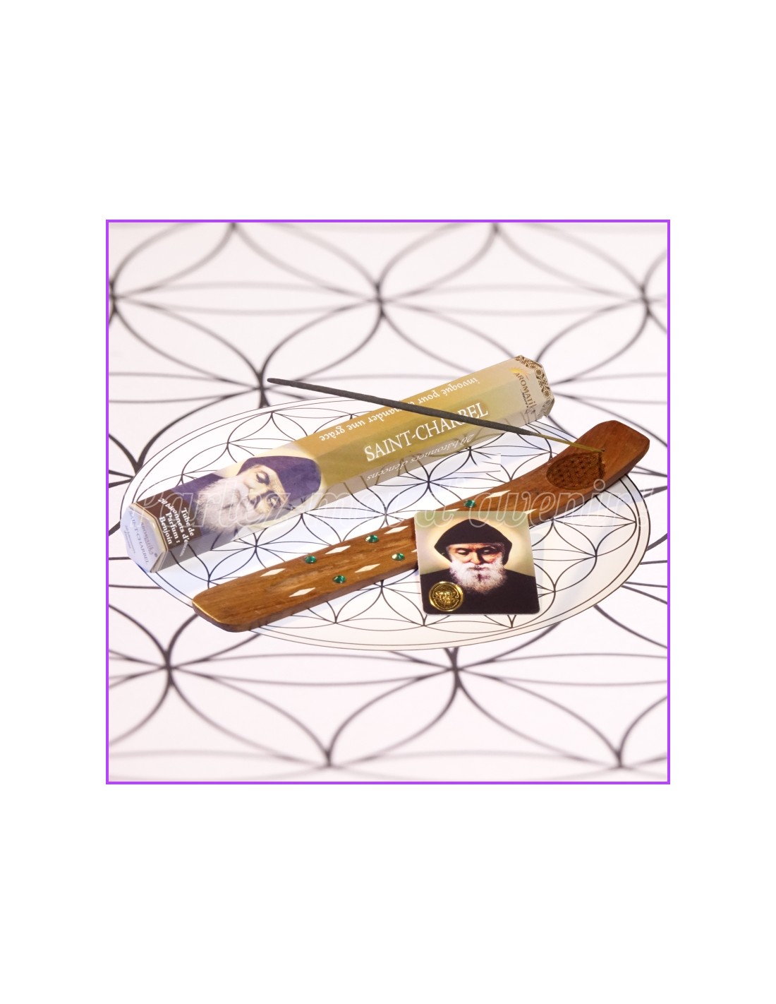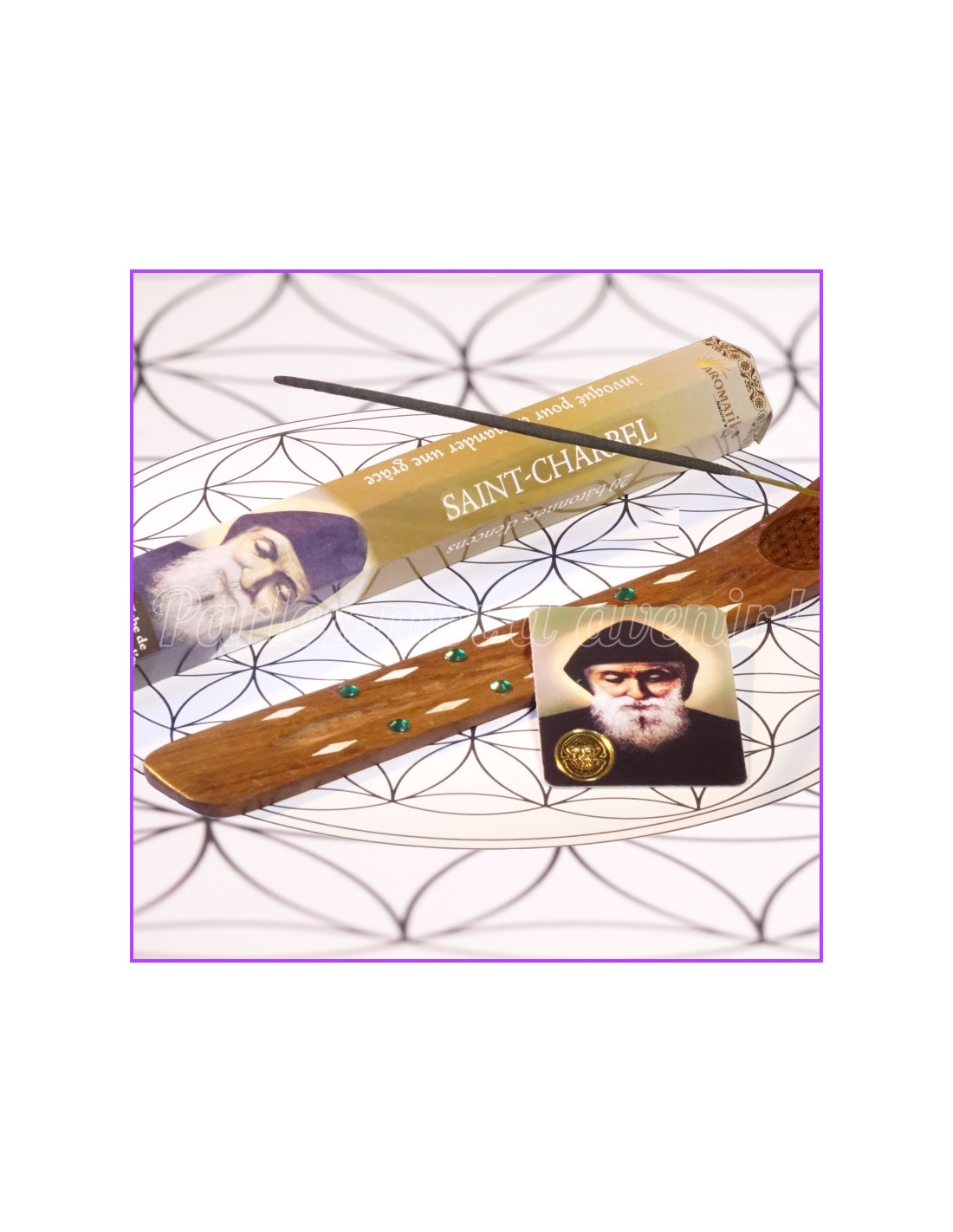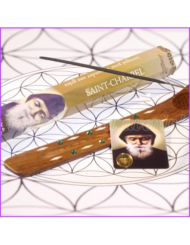 Bâtonnets encens SAINT CHARBEL parfum de Benjoin + carte prière à Saint Charbel + porte encens en bois